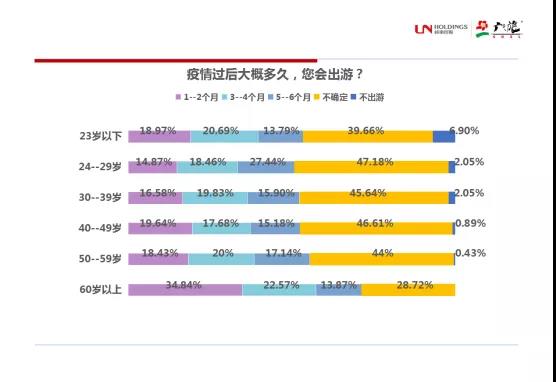 游客的看法又如何呢?從《報告》中受訪者的出游意愿來看,雖然目前國內(nèi)疫情已逐漸向好,但此前積累的不安情緒依然影響著市民外出旅游的行動力,近4成受訪者出游計劃尚“不確定”,可值得留意的是,未來半年完全不出游的“宅家一族”僅占所有有效受訪者的3%不到,其余超過半數(shù)的受訪者都表達出“希望在疫情結(jié)束后的1至6個月內(nèi)出游”的意愿;更有接近35%60歲以上的長者人群表達了疫情結(jié)束后1個月內(nèi)即出游的強烈意愿,廣之旅方面預(yù)計此類人群也將成為旅游業(yè)復(fù)蘇初期的出游主力軍,而首波出游高峰則有可能會在再度官宣放假5天的“五一小黃金周”到來。